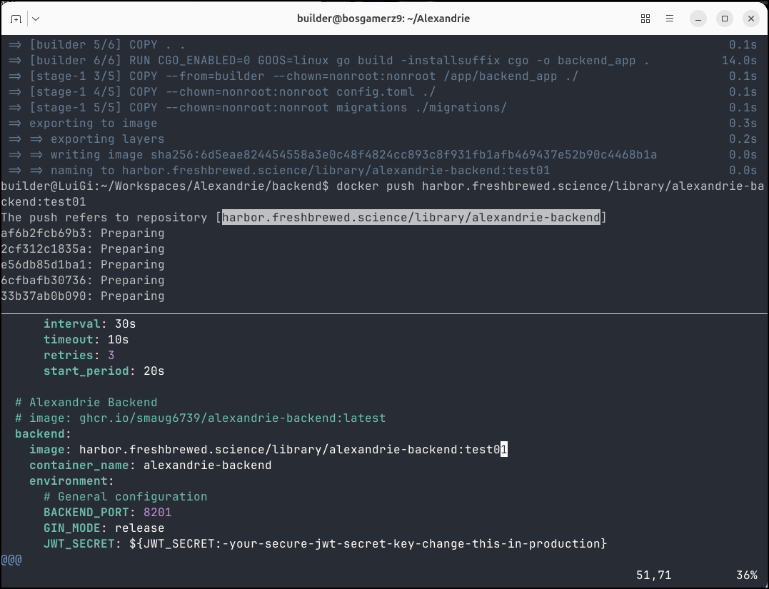 Next, we’ll look again at Alexandrie, but I did want to point out that I used the split view in Ghostty to make it easier to update docker compose with images I had just built and pushed