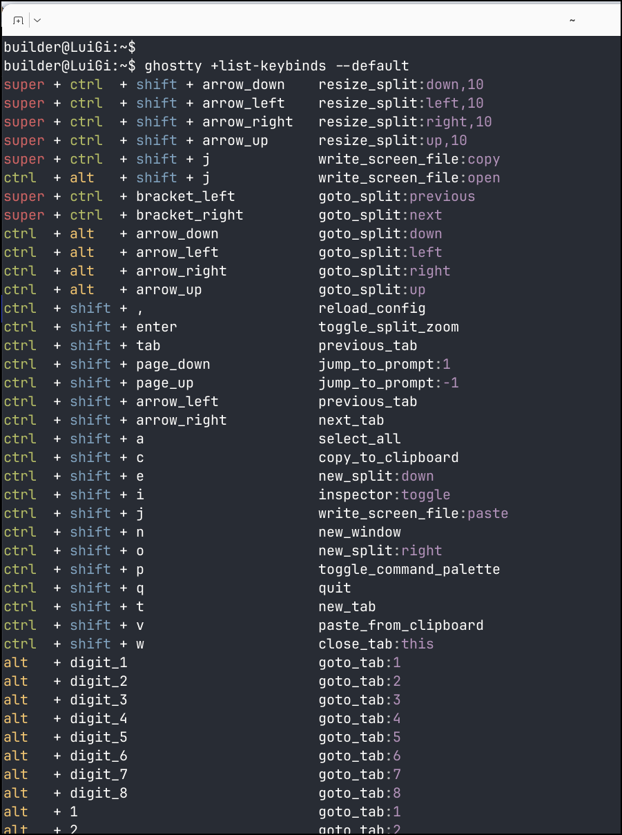 We can use the command ghostty +list-keybinds --default to see key bindings that are set by default (all of them can be changed as well)
