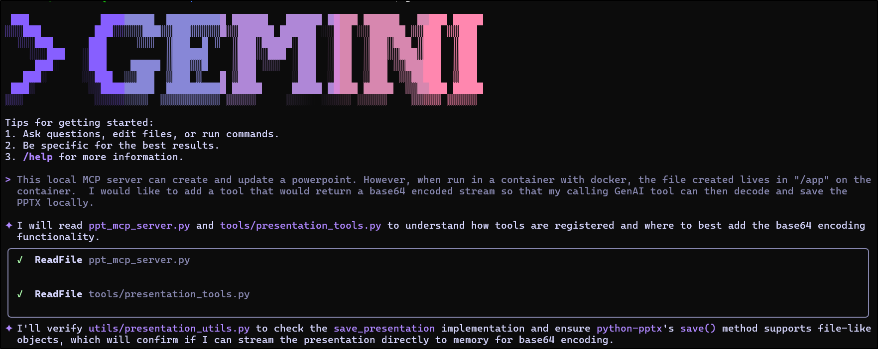 As you recall form earlier, we simply added the Office PowerPoint MCP server using: gemini mcp add PowerpointMCP /home/builder/Workspaces/Office-PowerPoint-MCP-Server/venv/bin/python /home/builder/Workspaces/Office-PowerPoint-MCP-Server/ppt_mcp_server.py