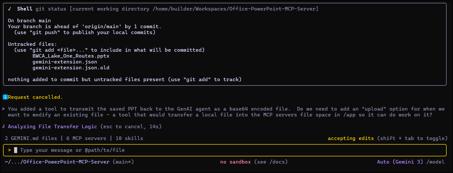 I also went and added the PowerPoint MCP server (gemini mcp add PowerpointMCP /home/builder/Workspaces/Office-PowerPoint-MCP-Server/venv/bin/python /home/builder/Workspaces/Office-PowerPoint-MCP-Server/ppt_mcp_server.py) so we could test both