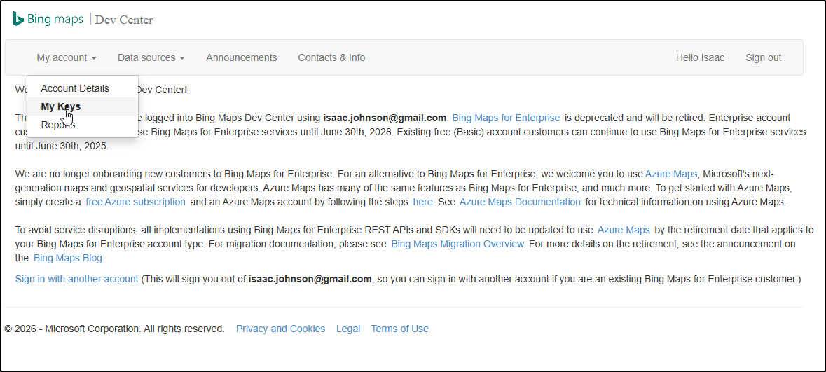 It seems they are moving from Bing Maps to Azure Maps in the near future, but for now, the API setup portal still lives