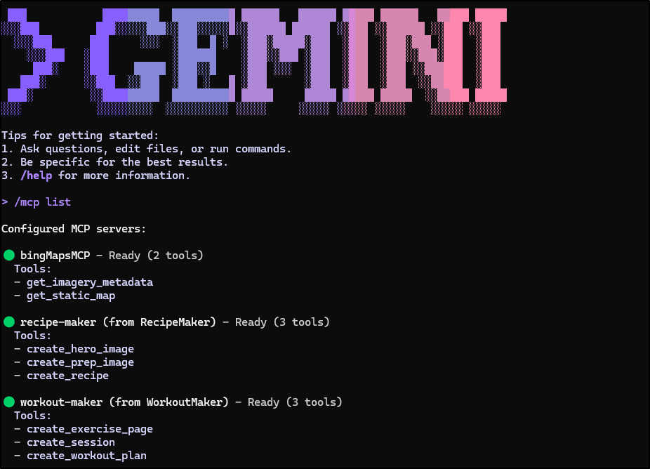 (venv) builder@LuiGi:~/Workspaces/bingMapsMCP$ gemini mcp add \