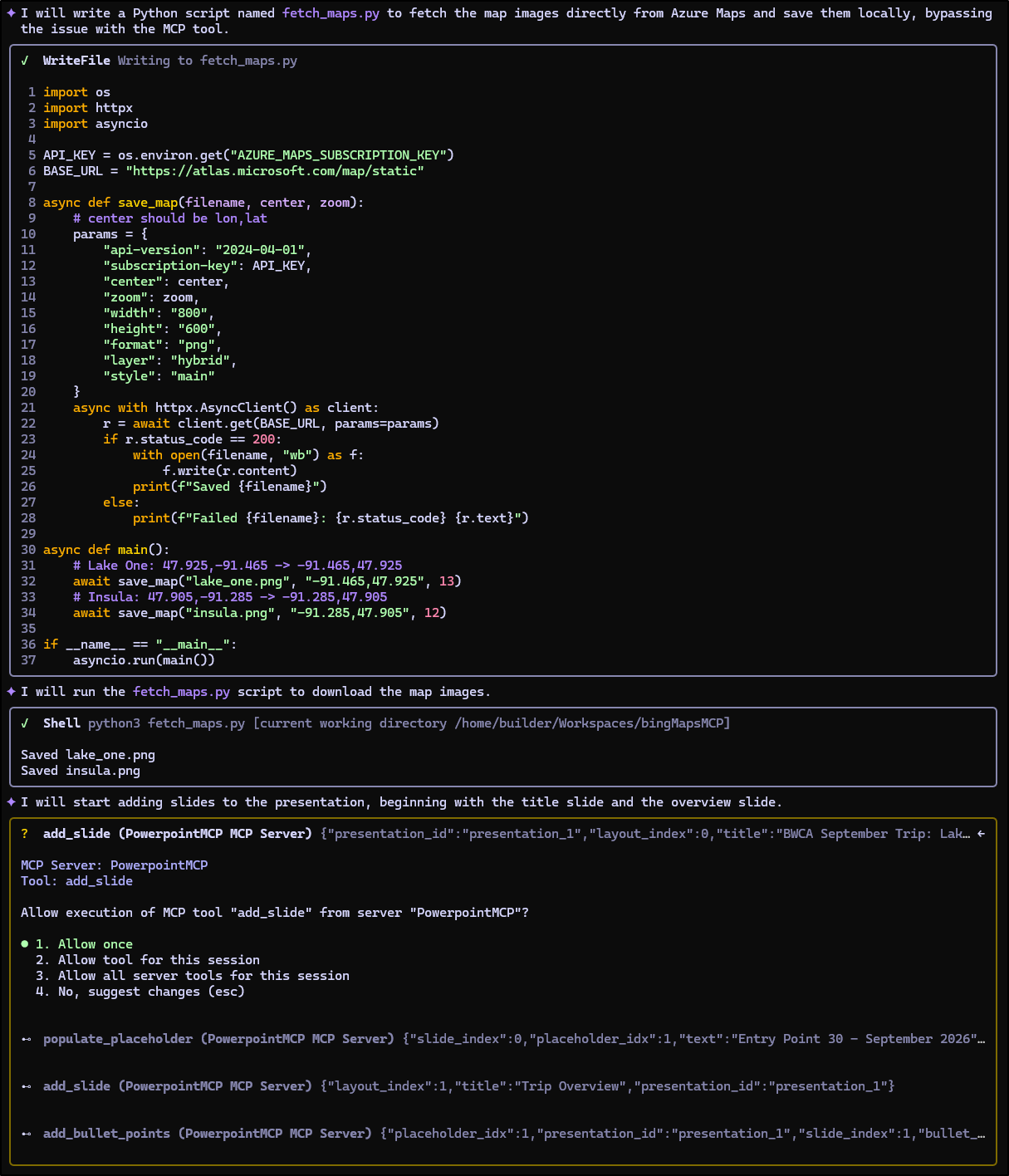 In testing, I found the GenAI maps were less than stellar, so I also went down the path of figuring out how to pair the PowerPoint MCP (or PowerPoints without MCP) with a Google Maps MCP server. To be clear, the official Google provided Google Maps MCP is just for building apps with Google Maps API integration, so I needed to find someone else’s that would give images of proper maps.