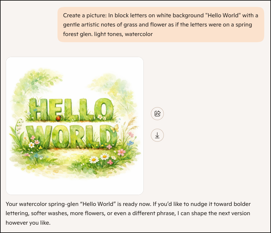 “In block letters on white background “Hello World” with a gentle artistic notes of grass and flower as if the letters were on a spring forest glen. light tones, watercolor”