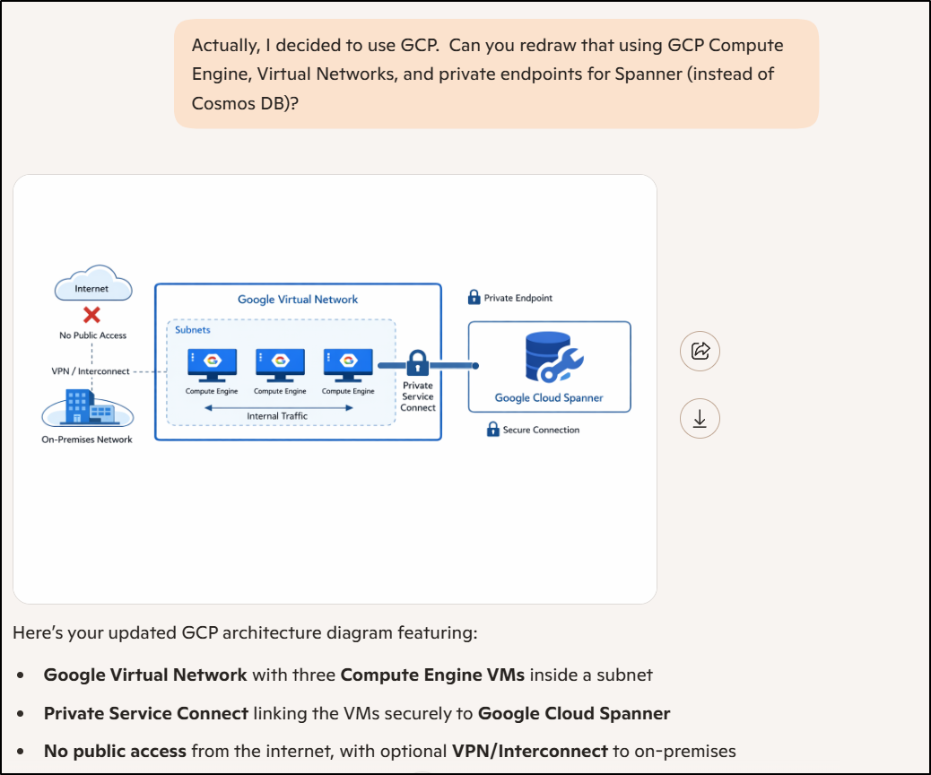 I asked it to pivot to GCP and, well it is right, but does look like a Microsoft product made the diagram