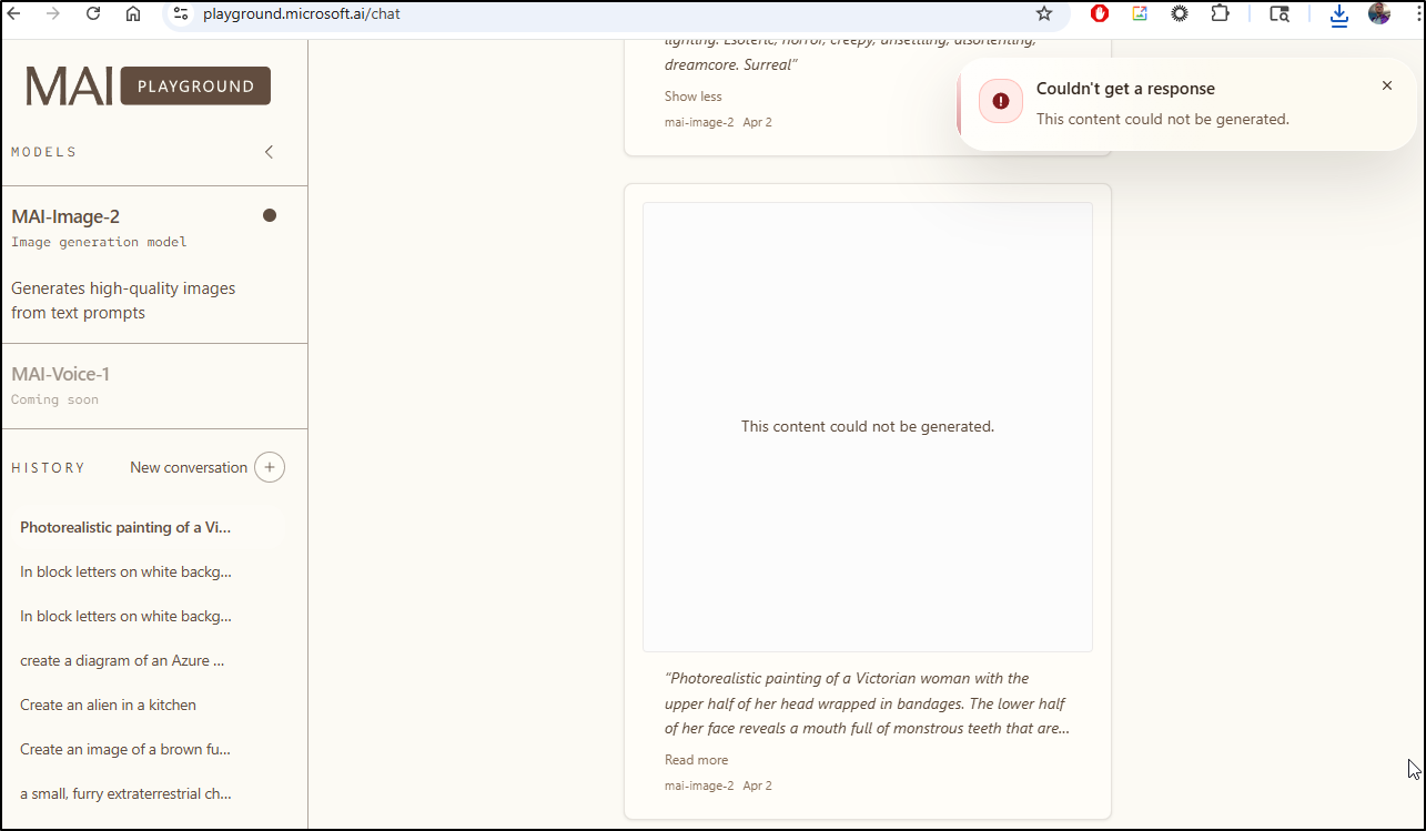 Overall I found MAI slow, and often rejecting my prompts. I found I got better results in all the other tools. I even tried using MS Paint (which yes, just uses Copilot)