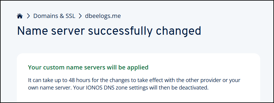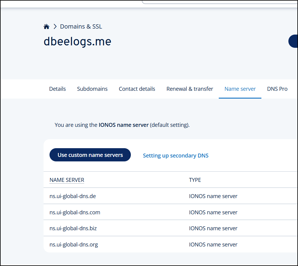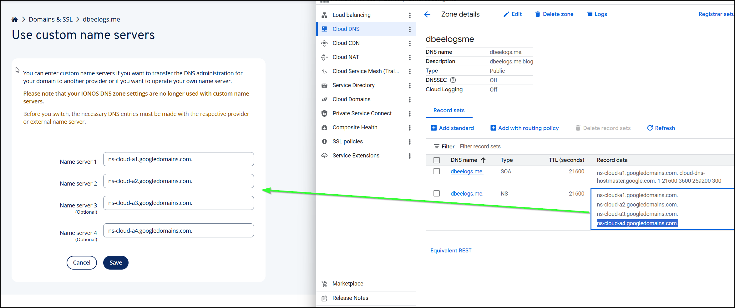 I can then copy the Google DNS server entries over to the Name Servers area in IONOS
