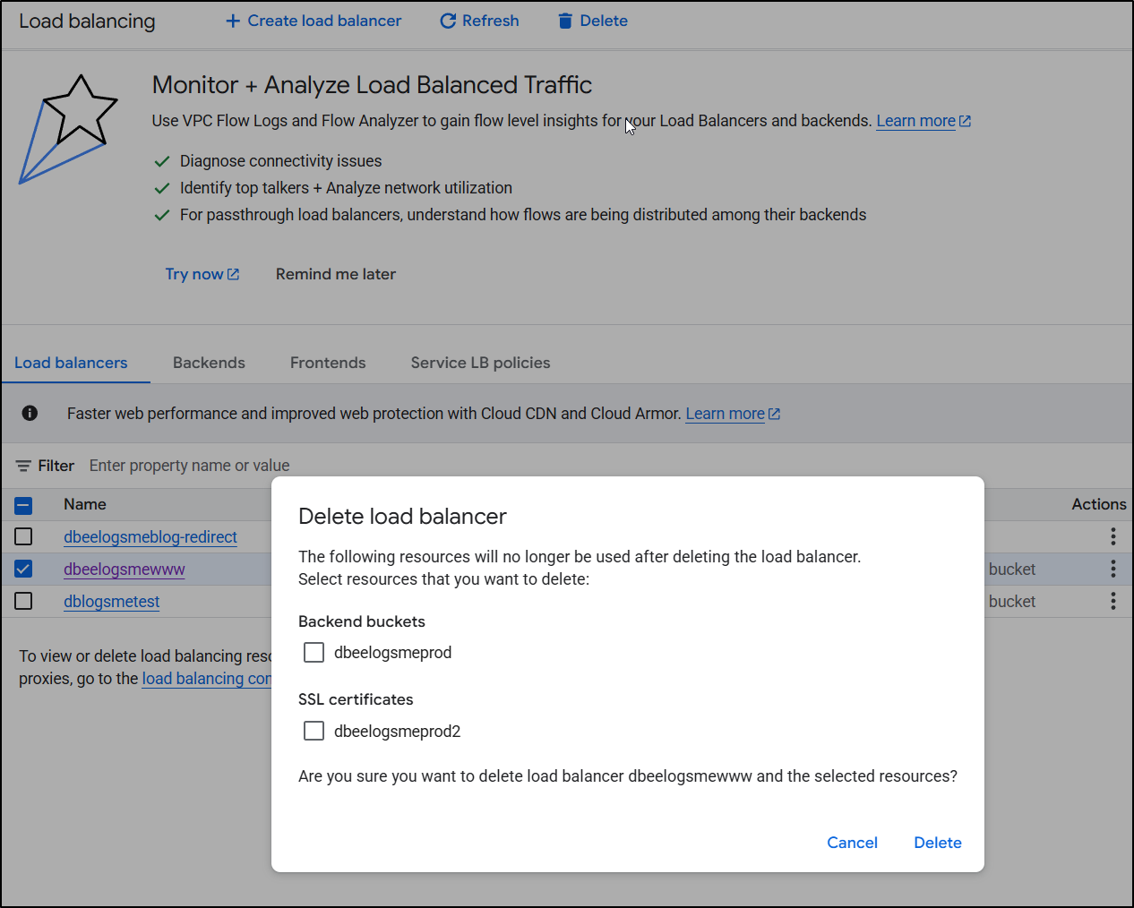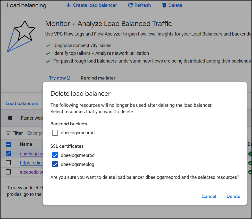 I will delete the “backend buckets” because they are just a pointer to storage buckets - it doesn’t actually delete the underlying bucket, just the ‘pointer’ “backend bucket”. I do think the wording on this is confusing. I will also delete the certs (they aren’t special, I can always re-create them).