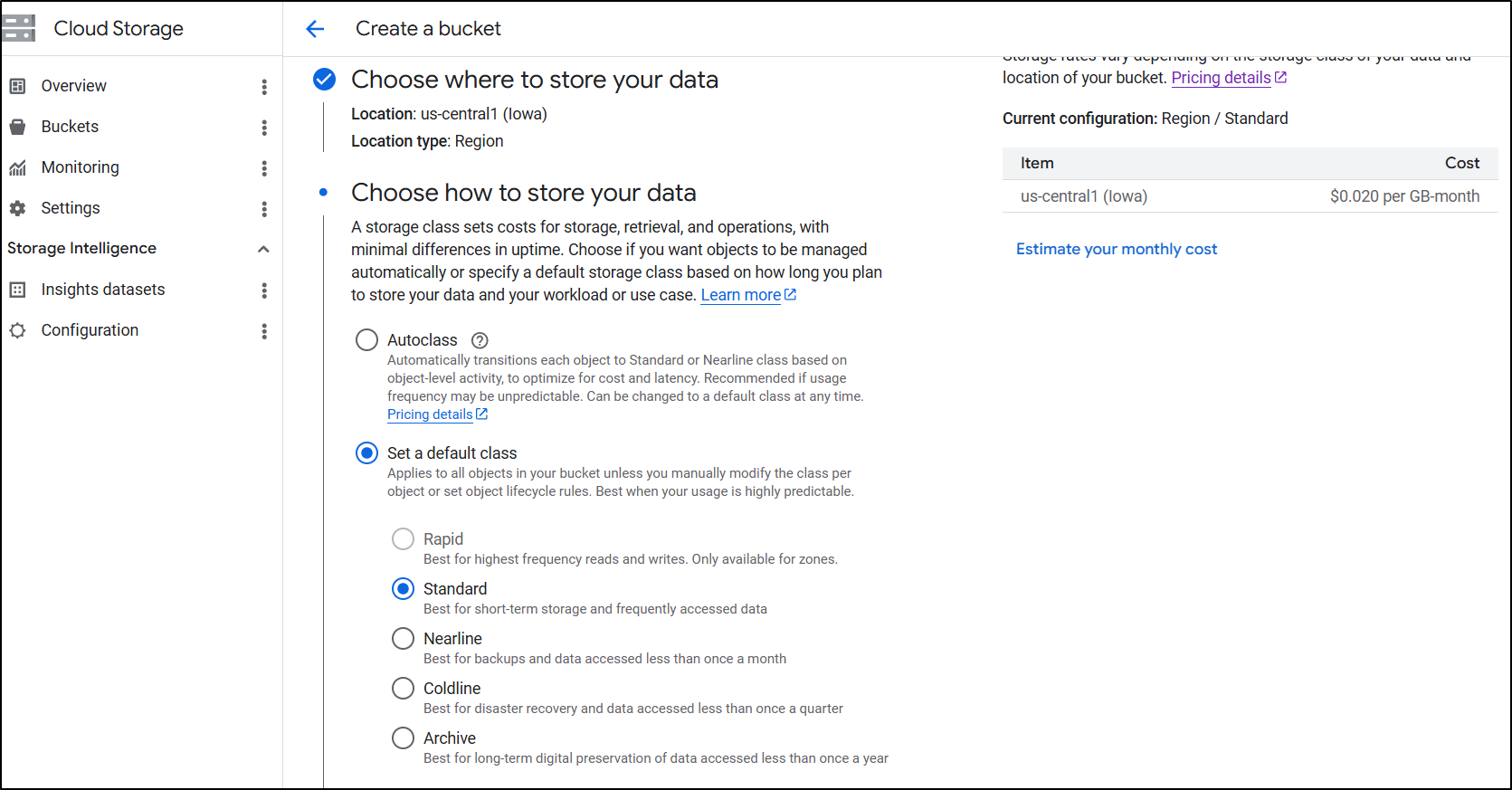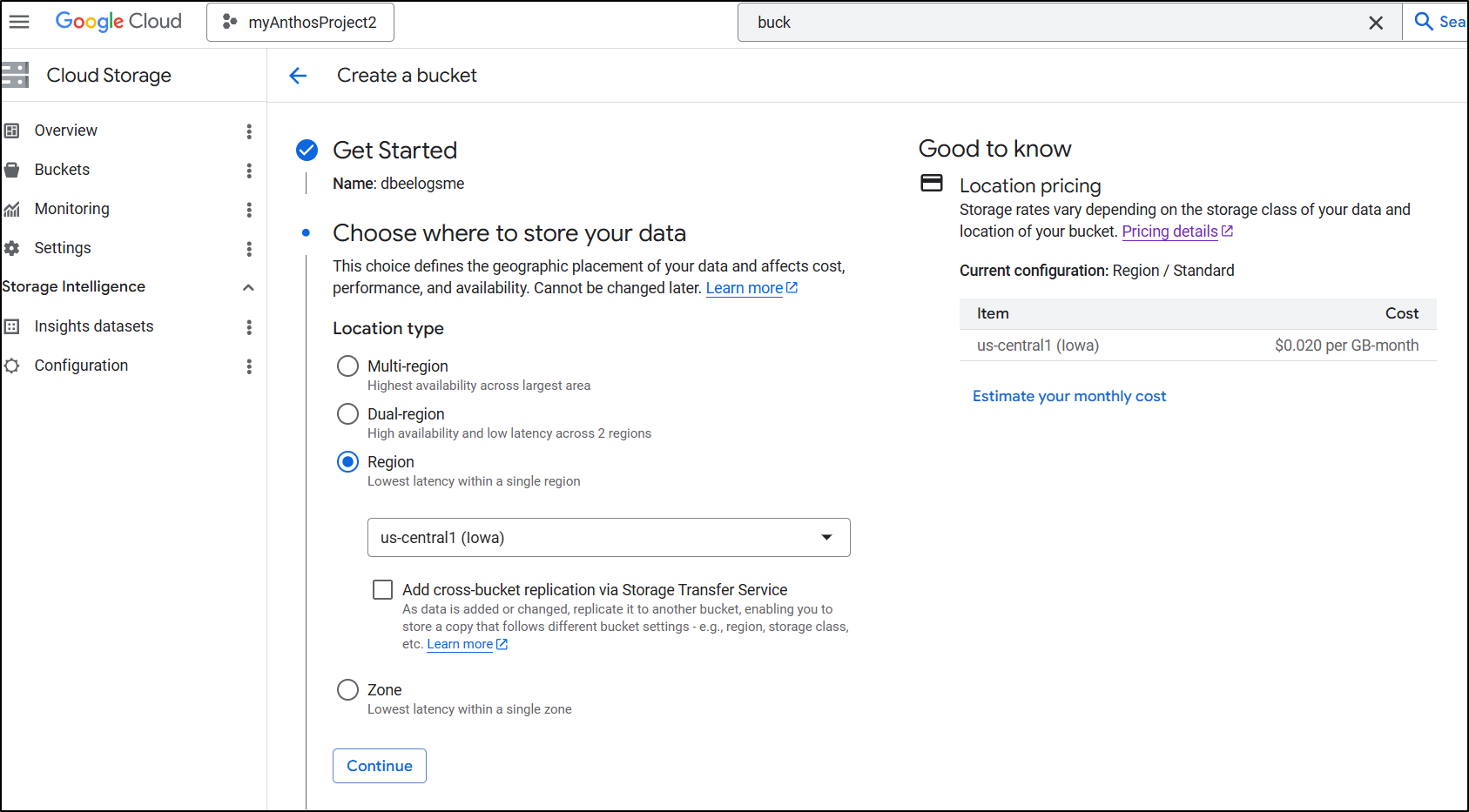 There isn’t really cost savings between zone and region (both are about 2c/gb/month) so I’ll pick a region near me.