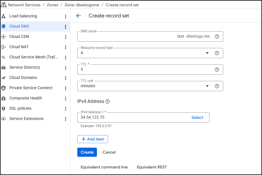 And use it in a new A record for test.dbeelogs.me