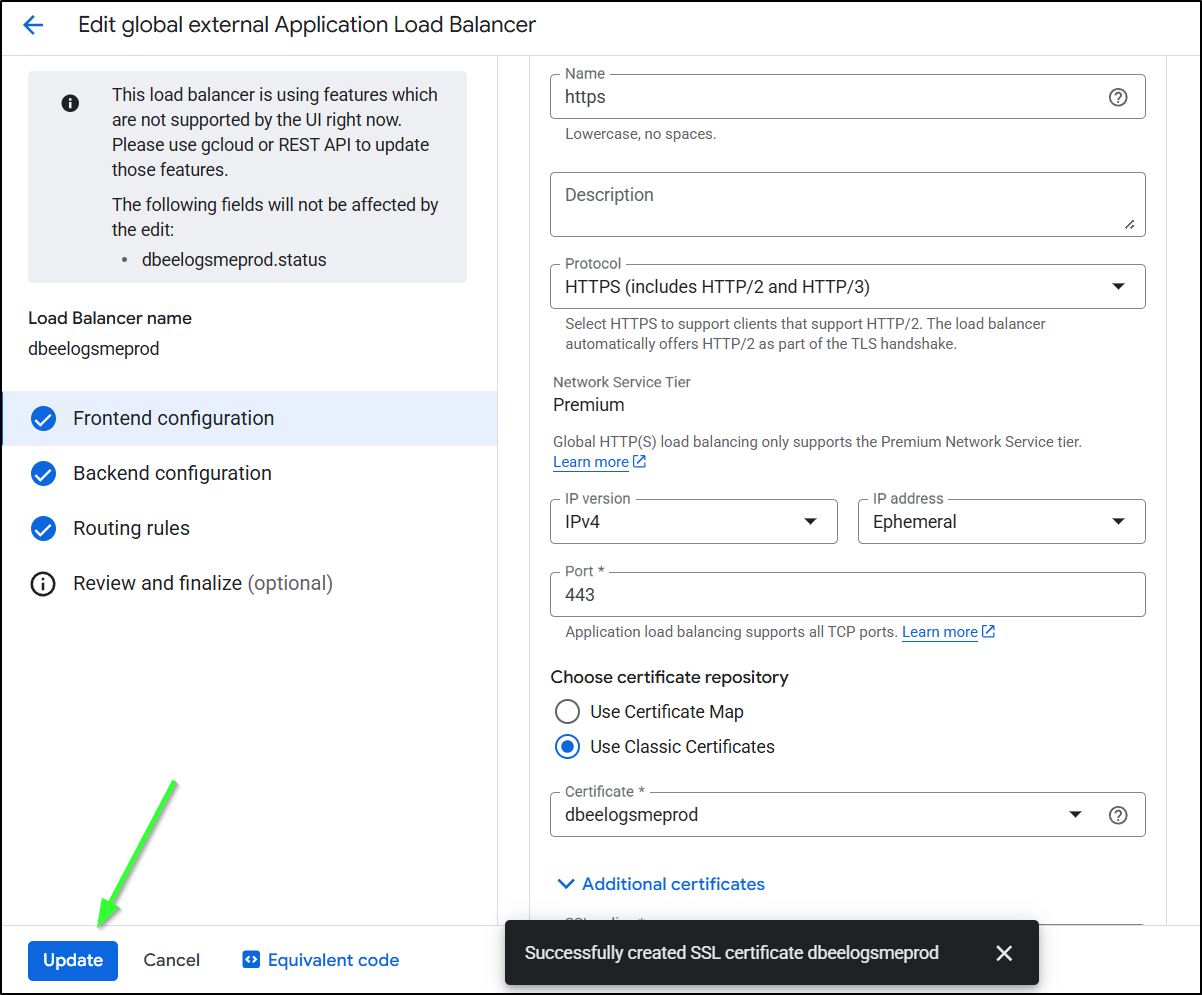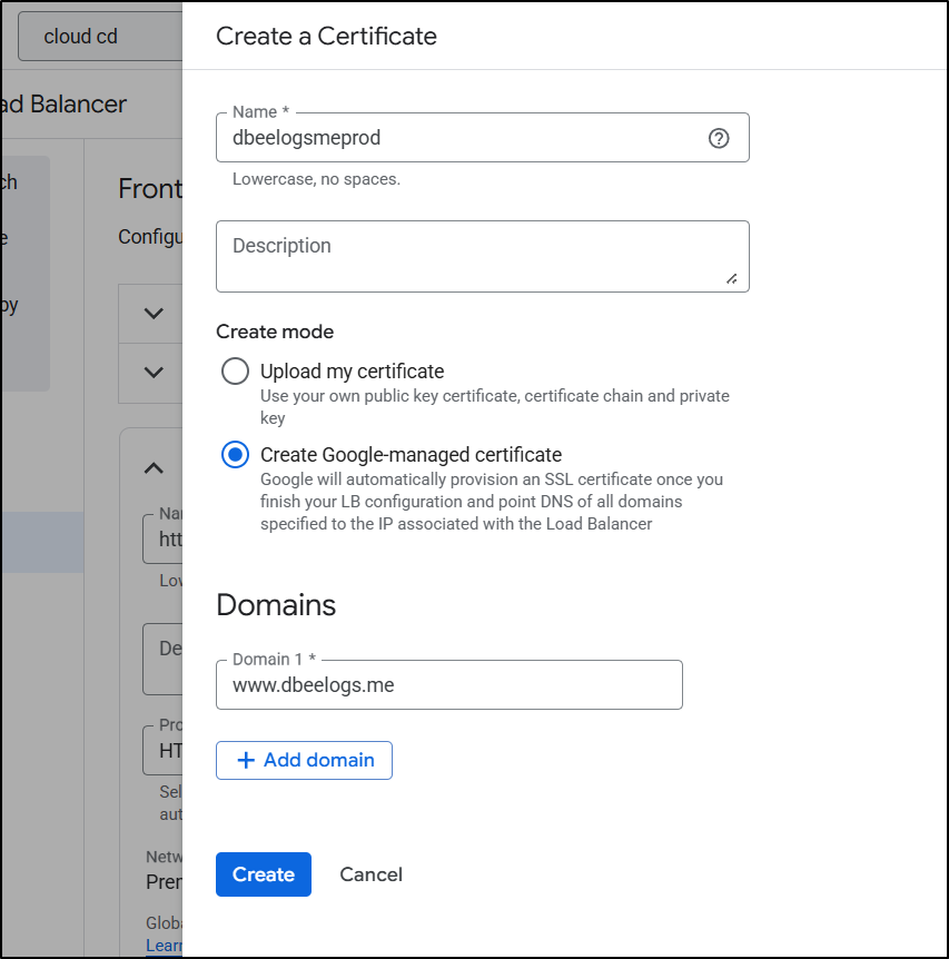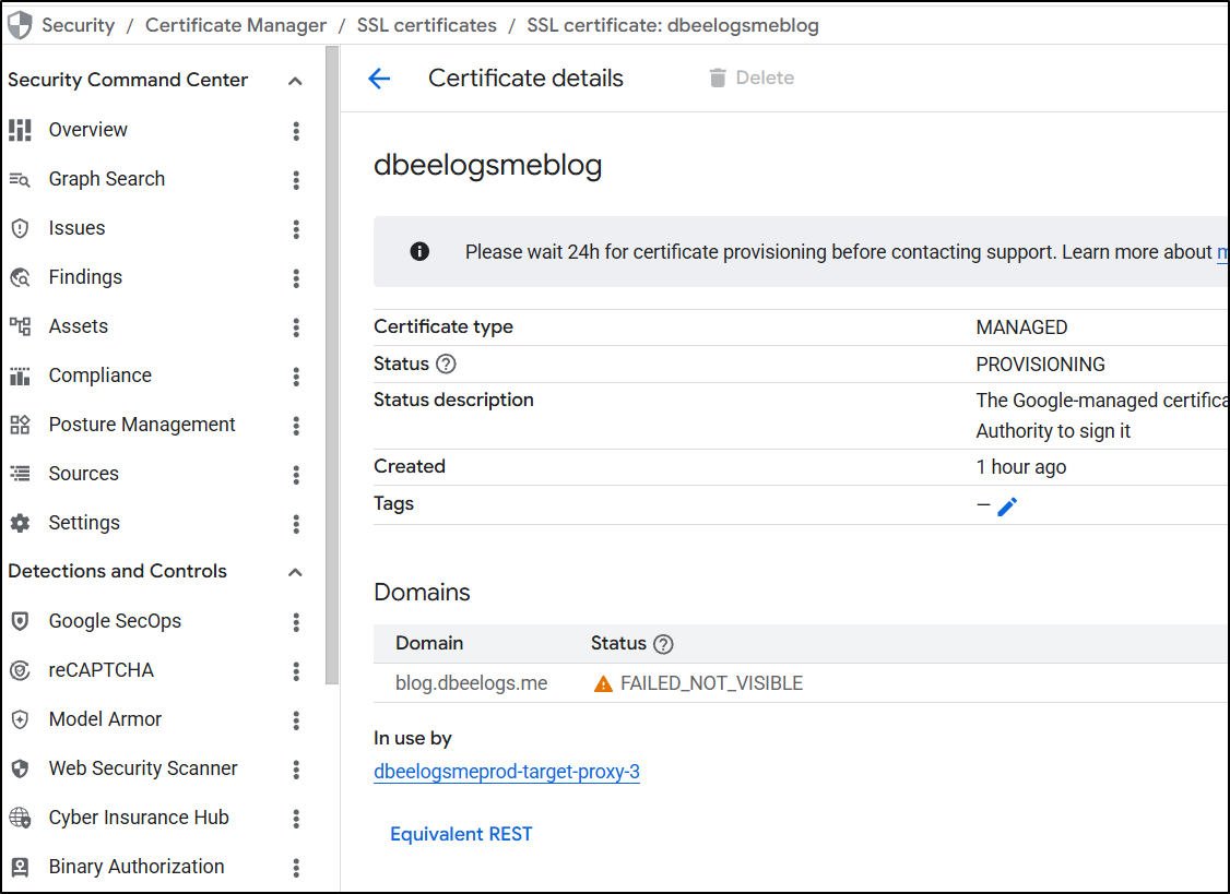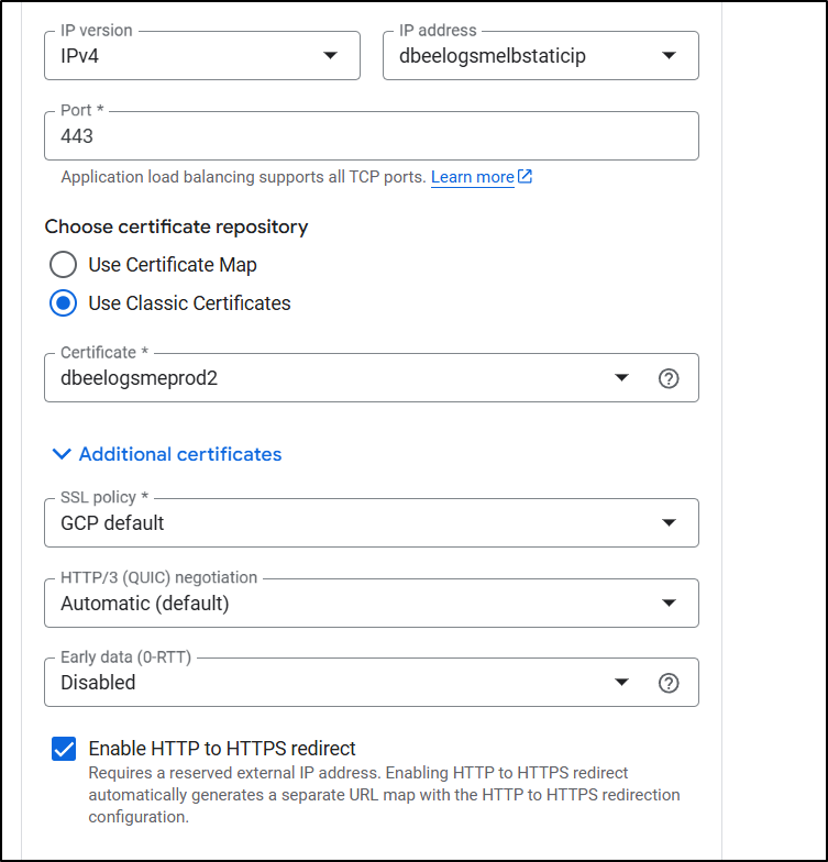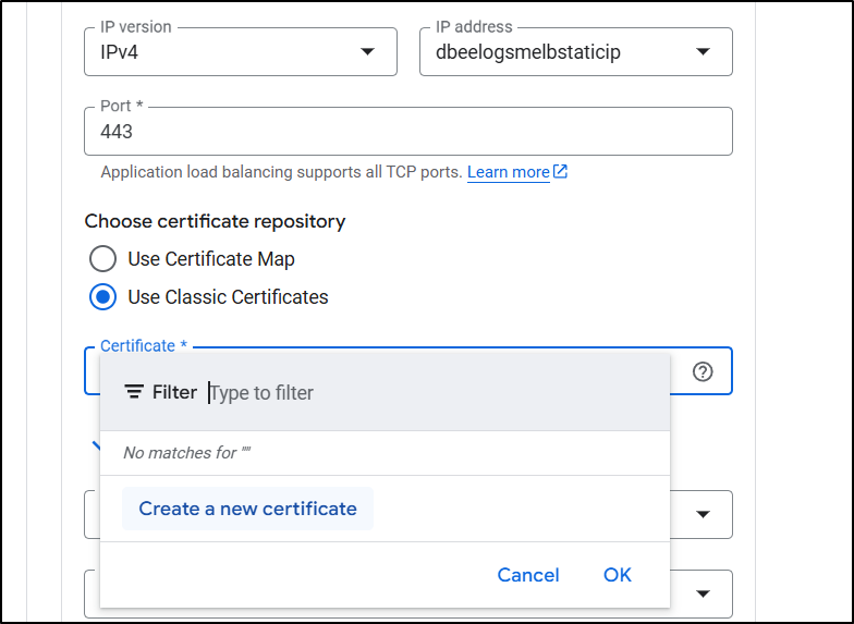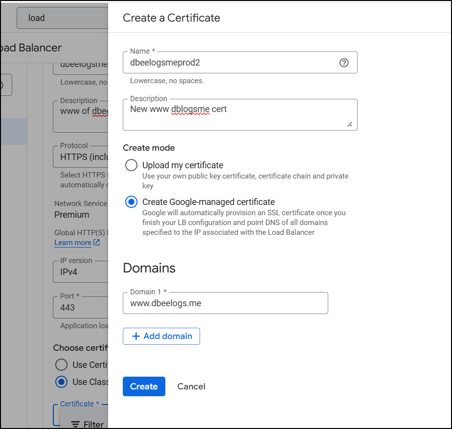 I spent entirely too much time debugging the flow. The fact is, GCP does not make the order of operations clear. Never, when I was trying to get certs working, did it suggest to create a missing A Record, or setup the static IPs first. At one point it made an unbound cert for www.dbeelogs.me that I couldn’t figure out how to use (as it wasn’t a ‘classic’ cert).