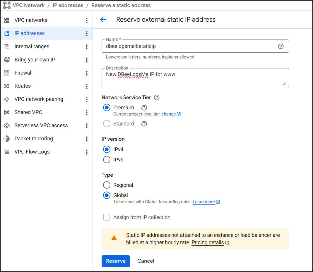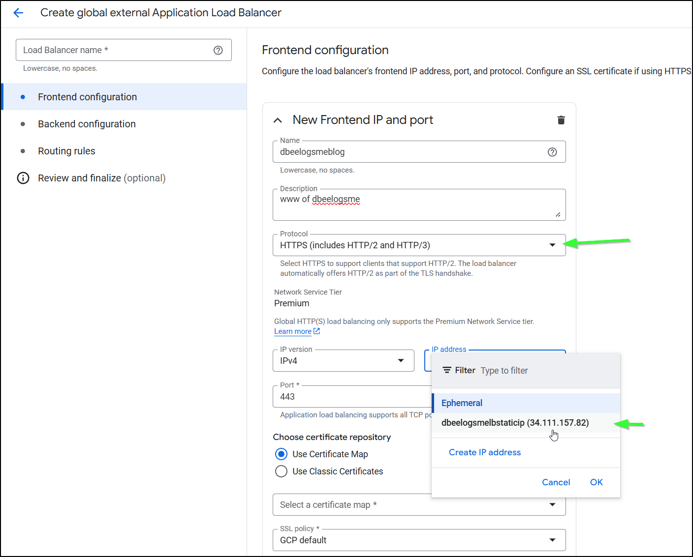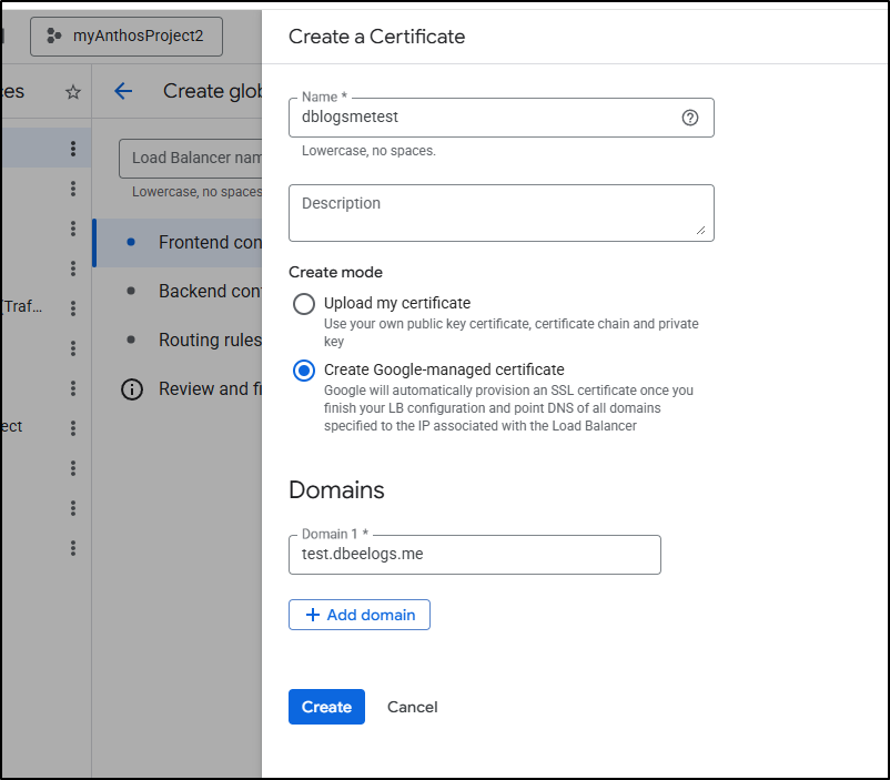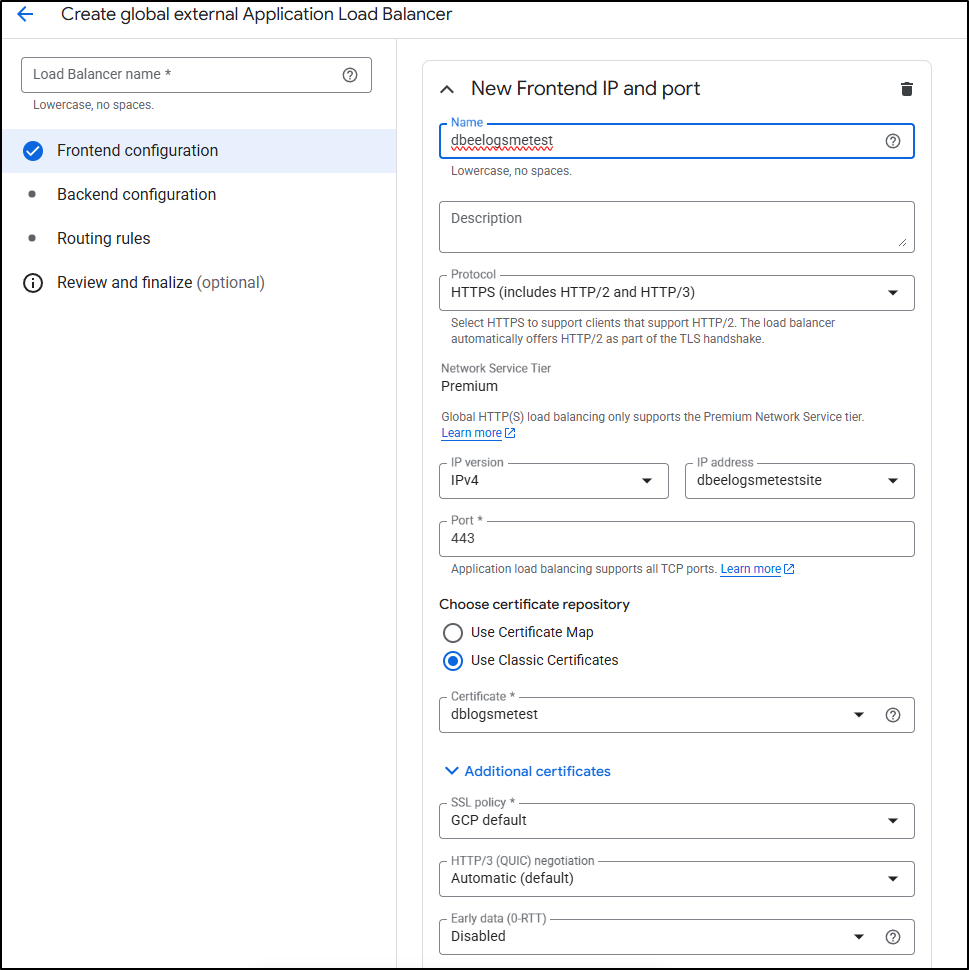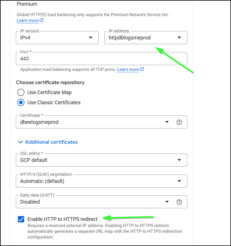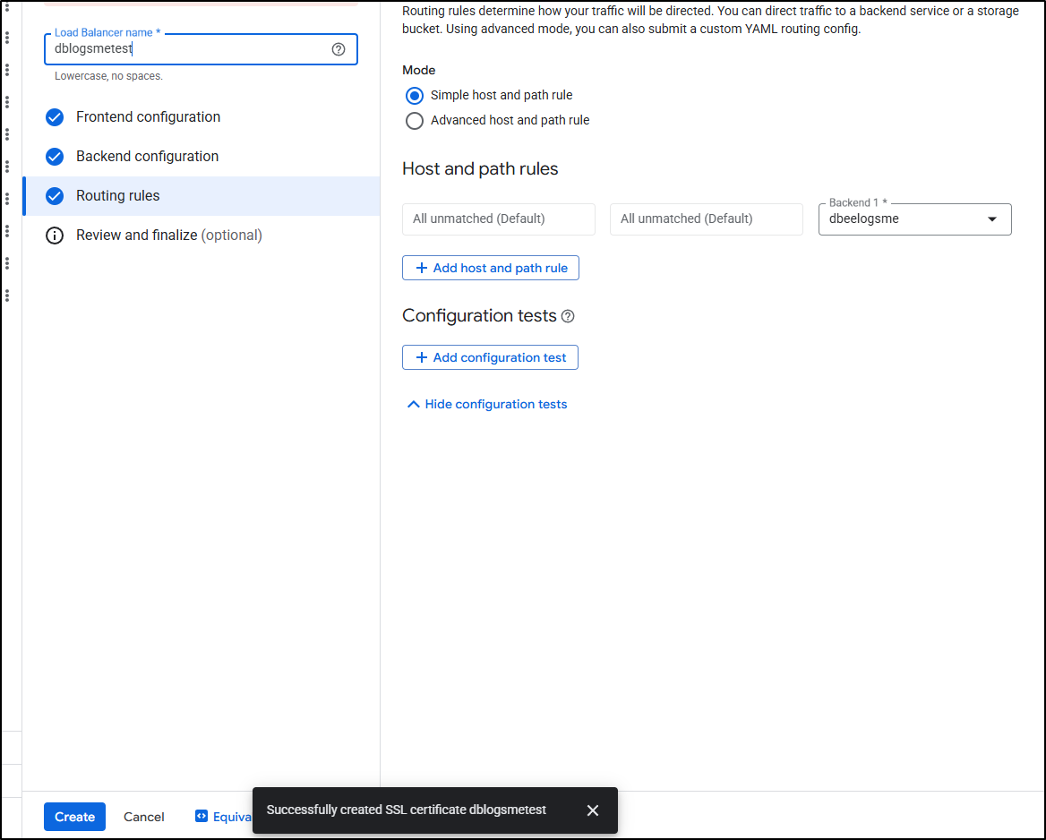 I spent entirely too much time debugging the flow. The fact is, GCP does not make the order of operations clear. Never, when I was trying to get certs working, did it suggest to create a missing A Record, or setup the static IPs first. At one point it made an unbound cert for www.dbeelogs.me that I couldn’t figure out how to use (as it wasn’t a ‘classic’ cert).