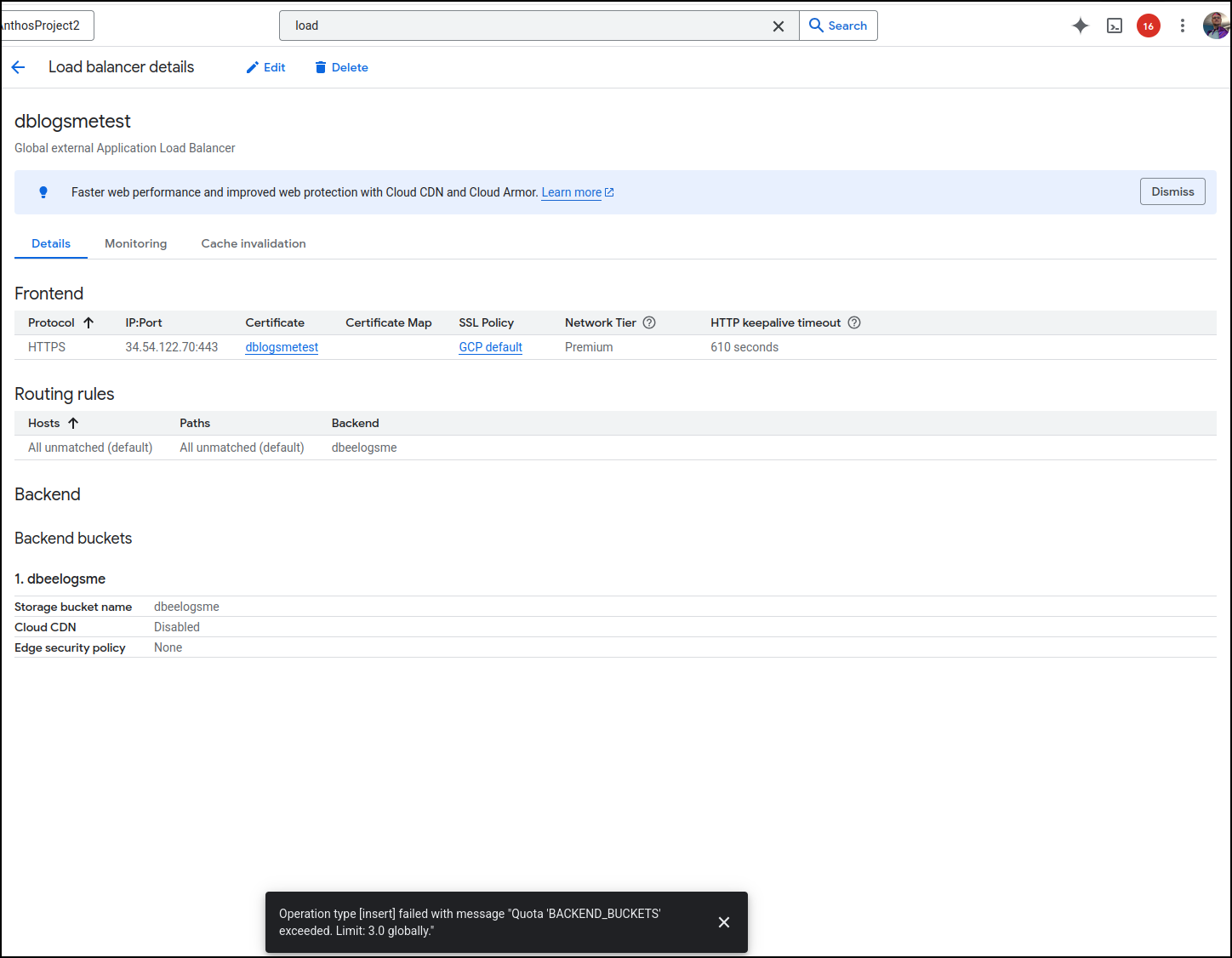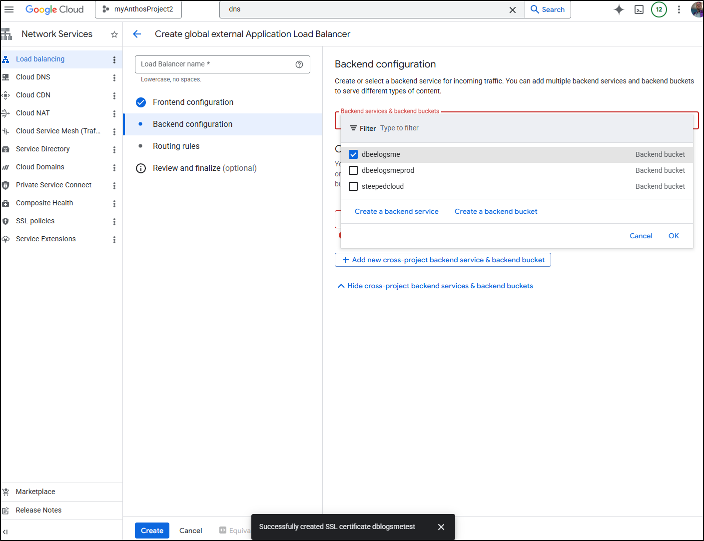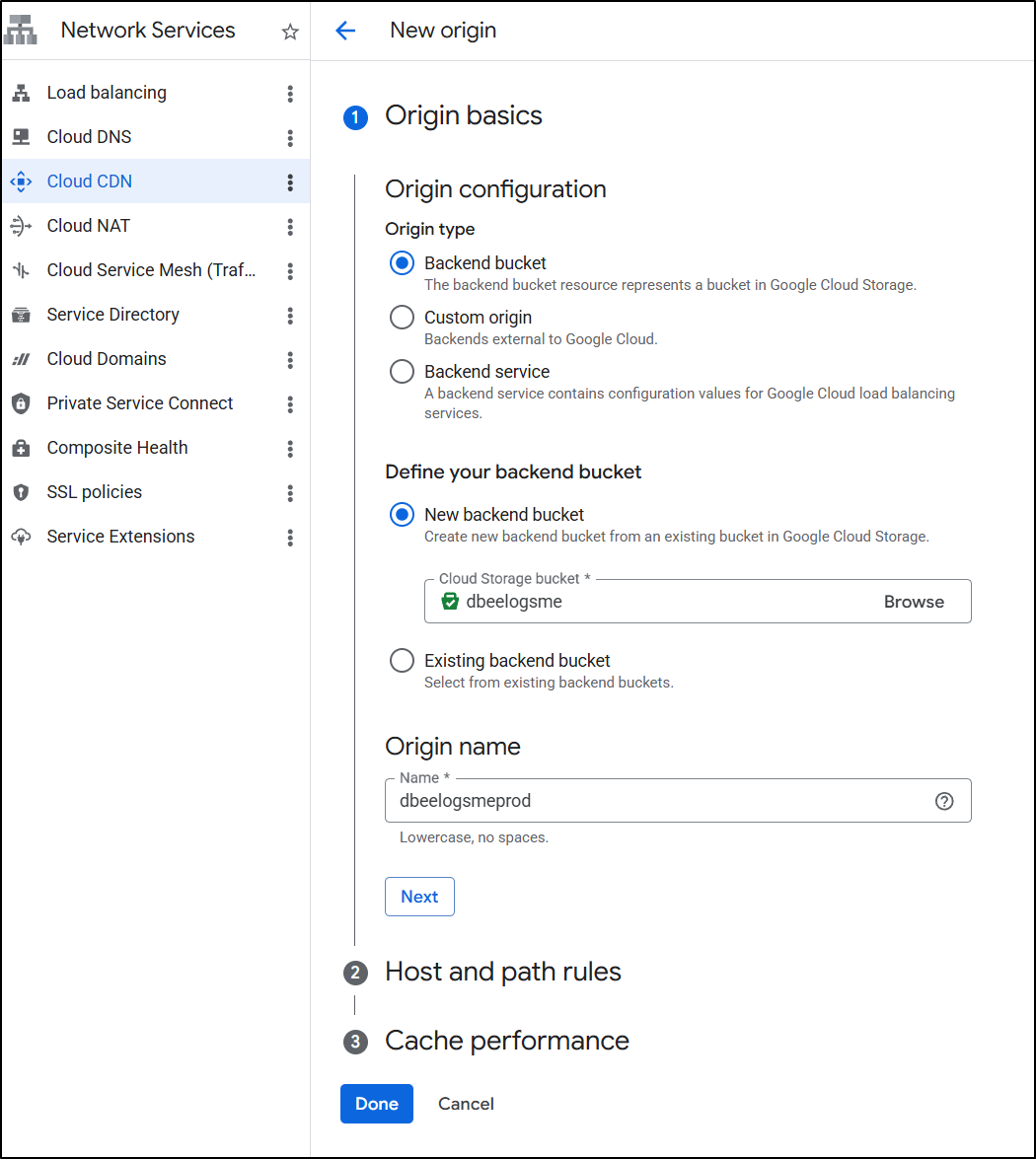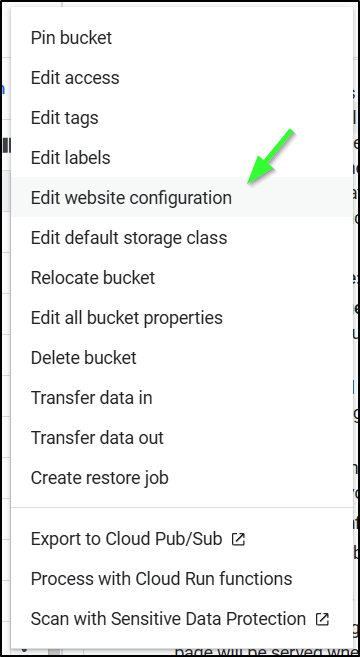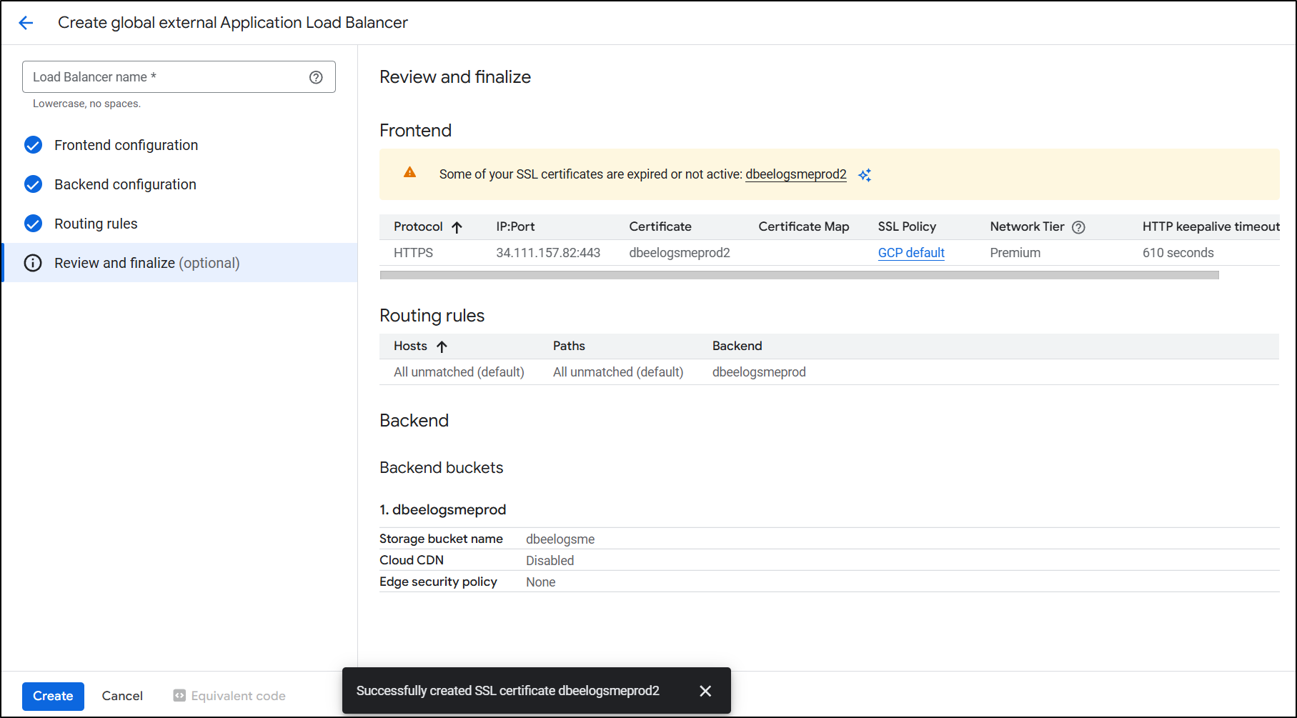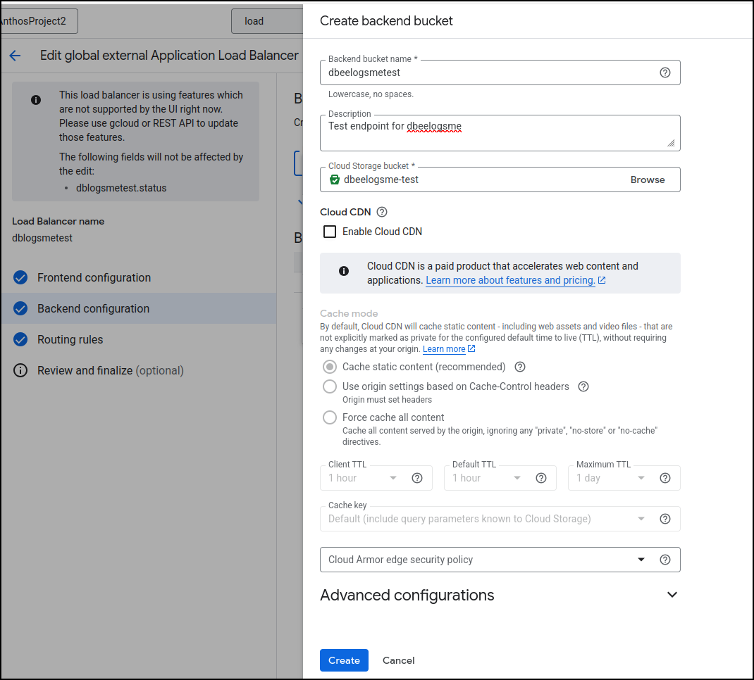 I went back to edit the backend configuration of the load balancer and instead of picking an existing bucket, I clicked “Create a backend bucket”