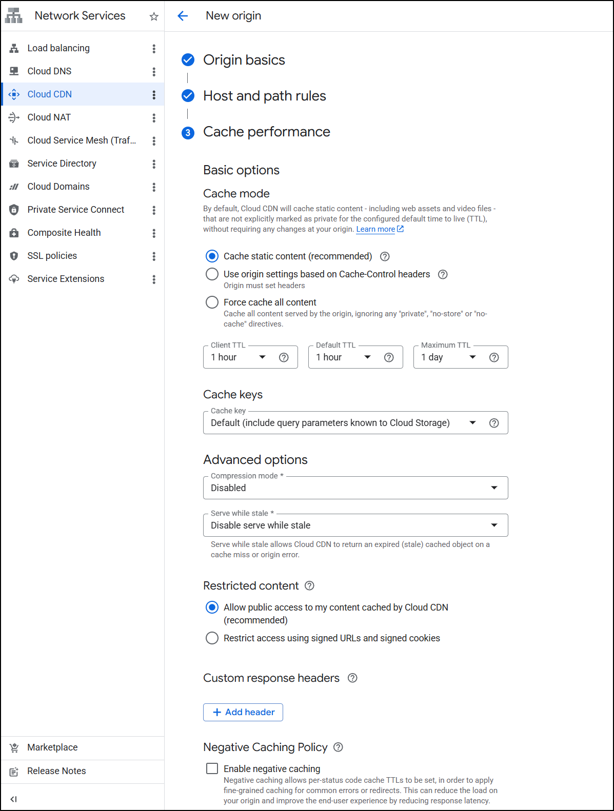 An important step here is to uncheck the “Enable Cloud CDN” checkbox. For a test site (which is just a preview of in-flux articles), we would not want any of them cached (as we are actively changing them)