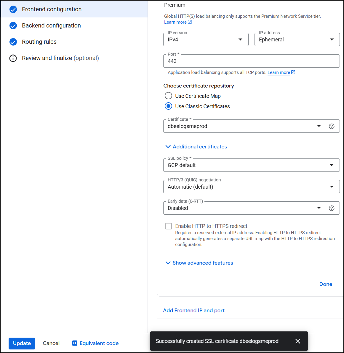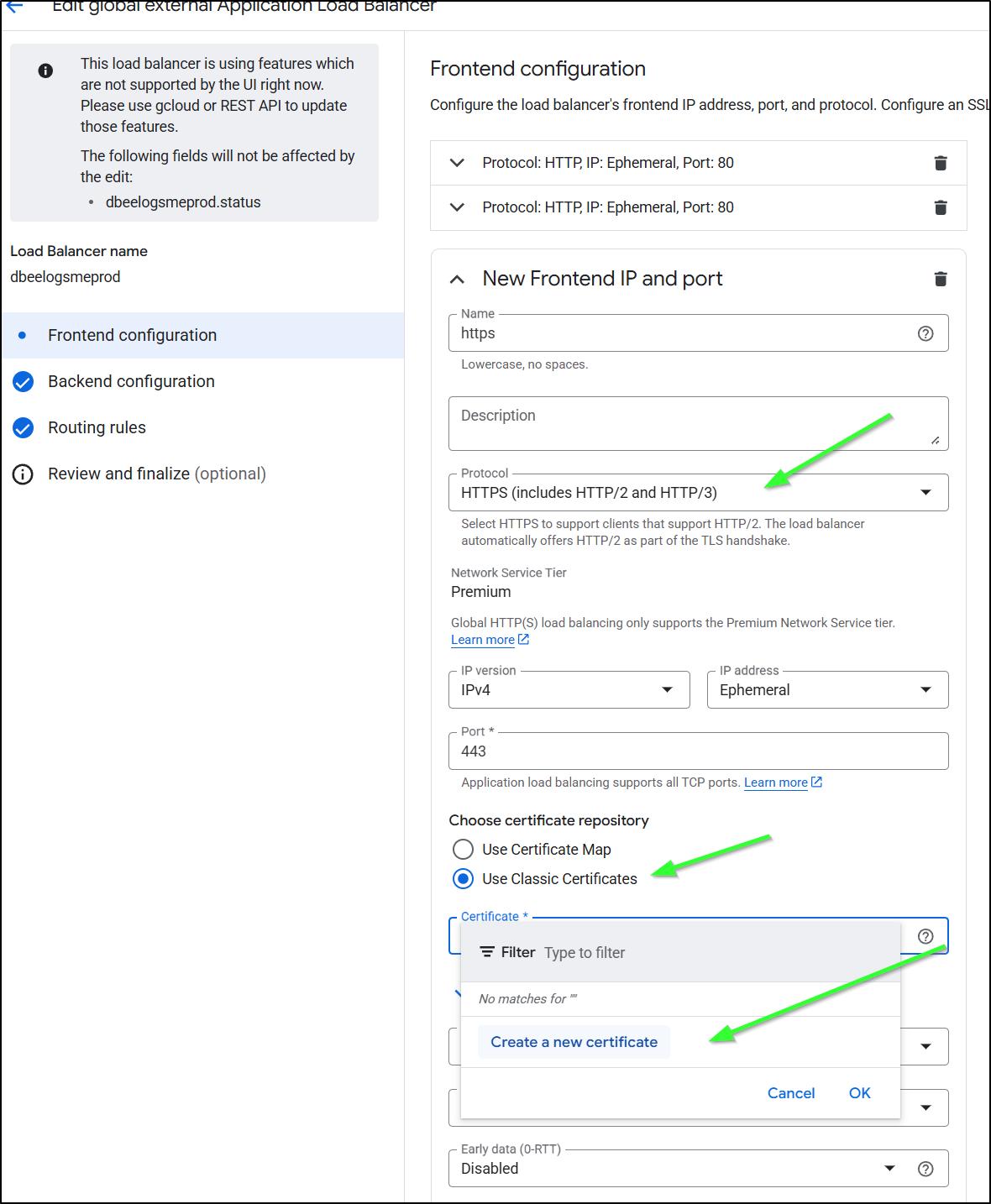 And create the certificate during the front-end configuration as before