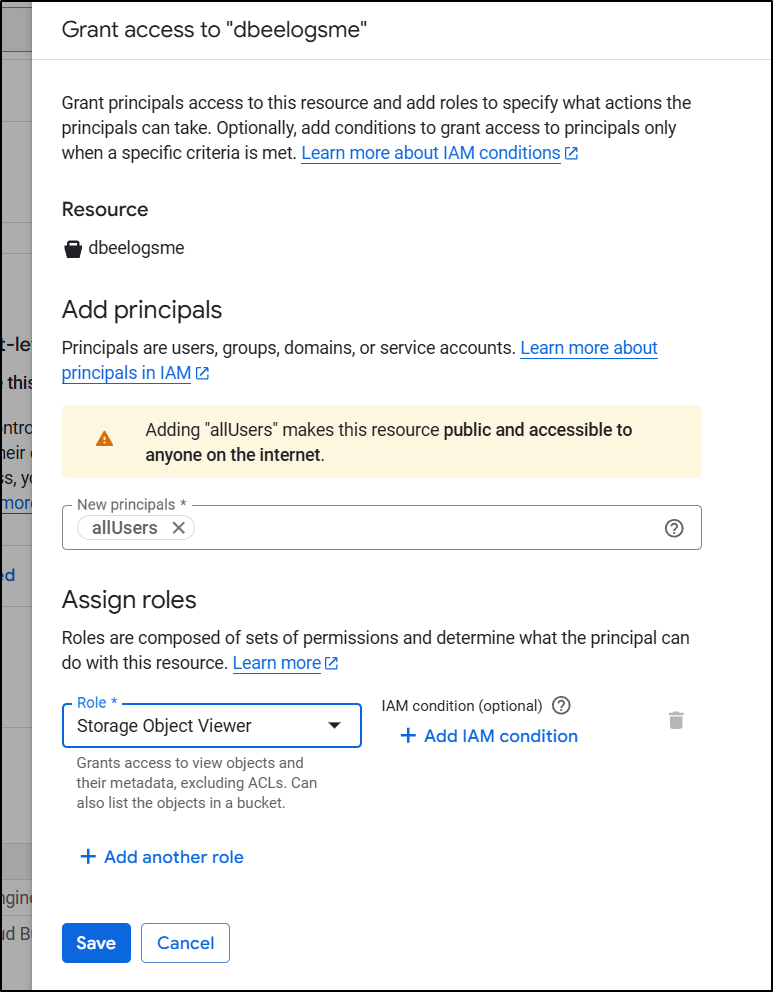 $ gcloud storage buckets add-iam-policy-binding gs://dbeelogsme \