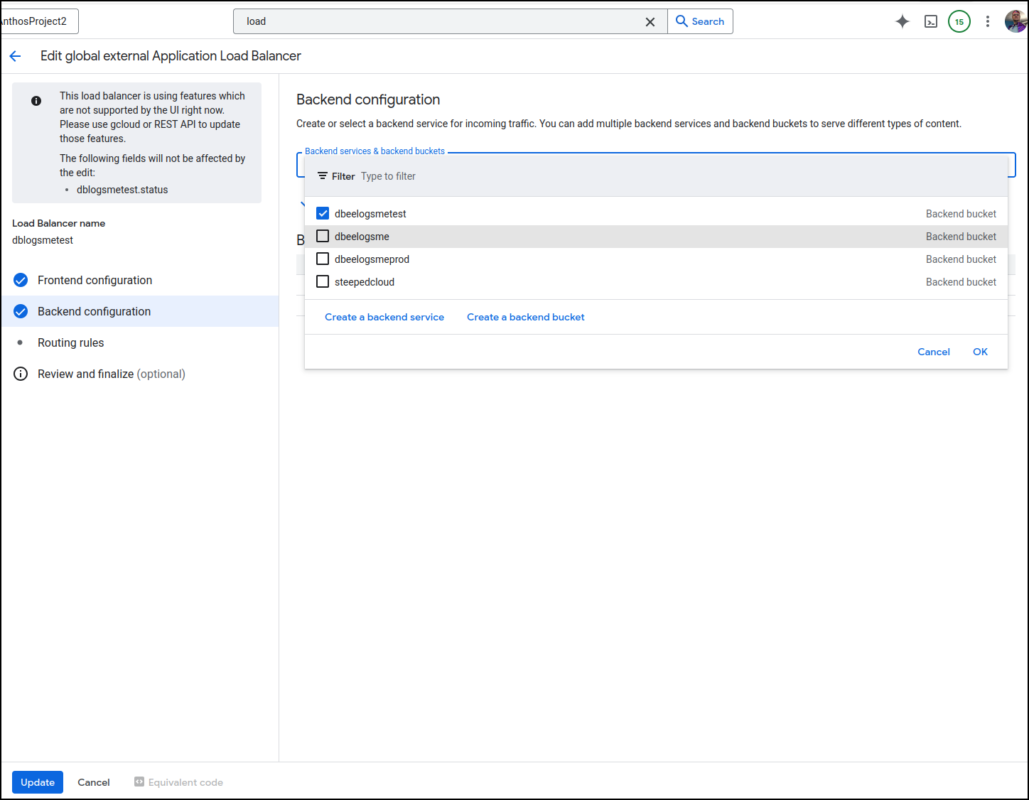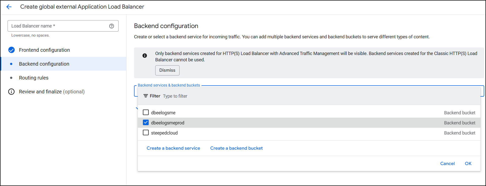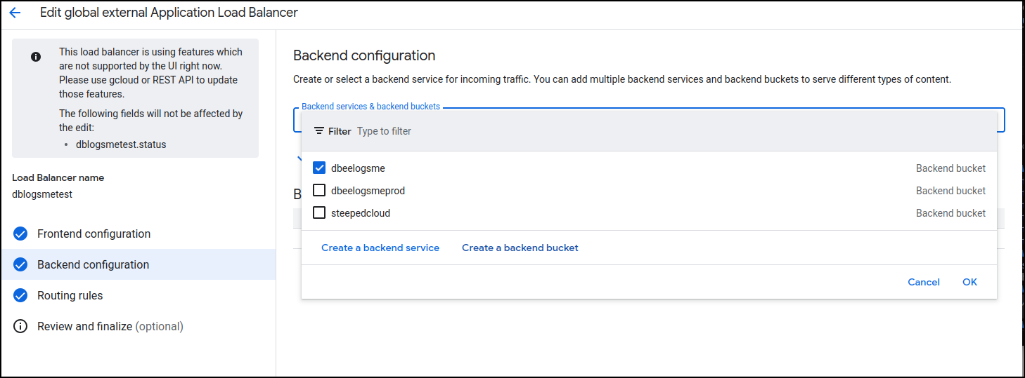 Because I did a Global Application Balancer, I can now pick a Bucket for a backend (prior, when using regional, I could only see VMs, Cloud Run, GKE etc, but not buckets)