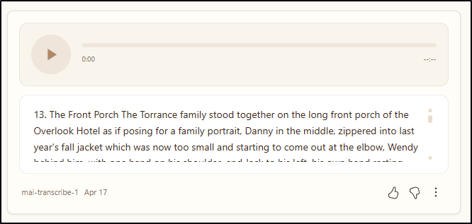 I tried another, a section from a 1977 Steven King audiobook “The Shining” as read by Campbell Scott. I had bought that audio book as MP3s at the time.