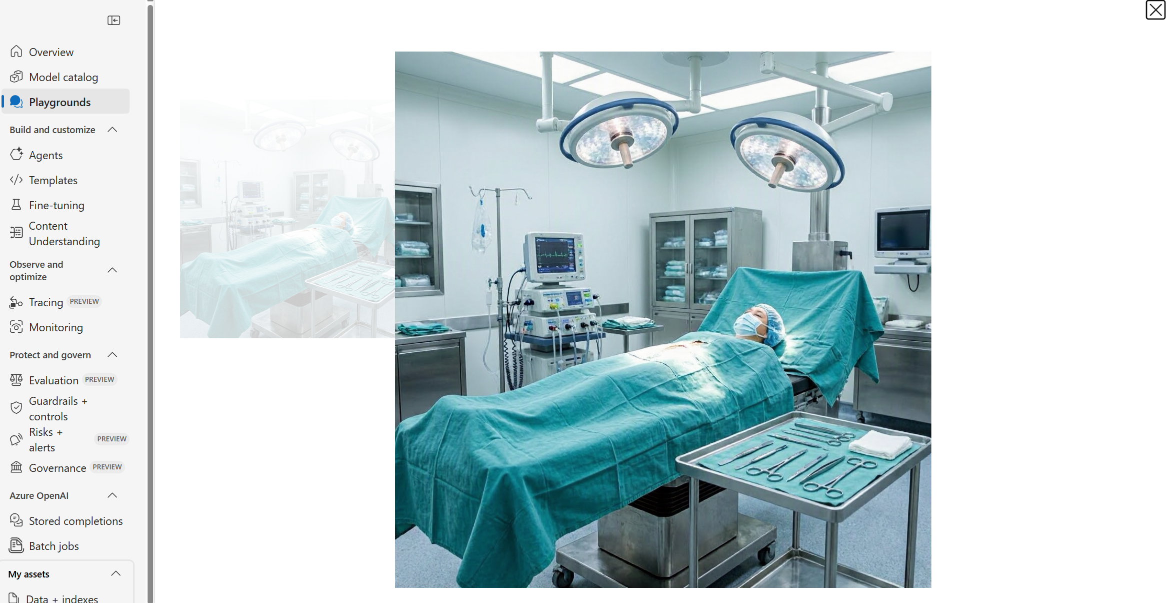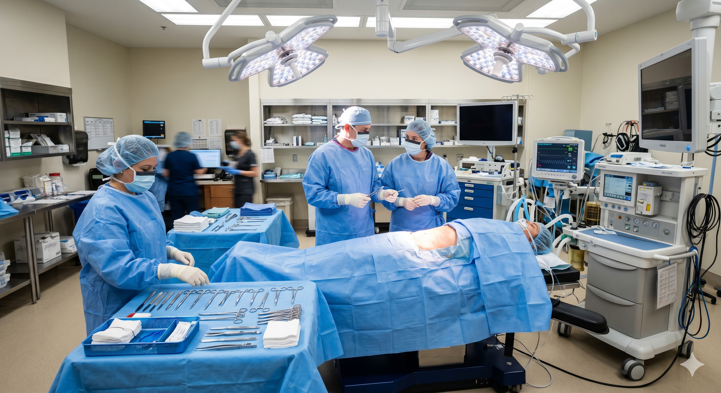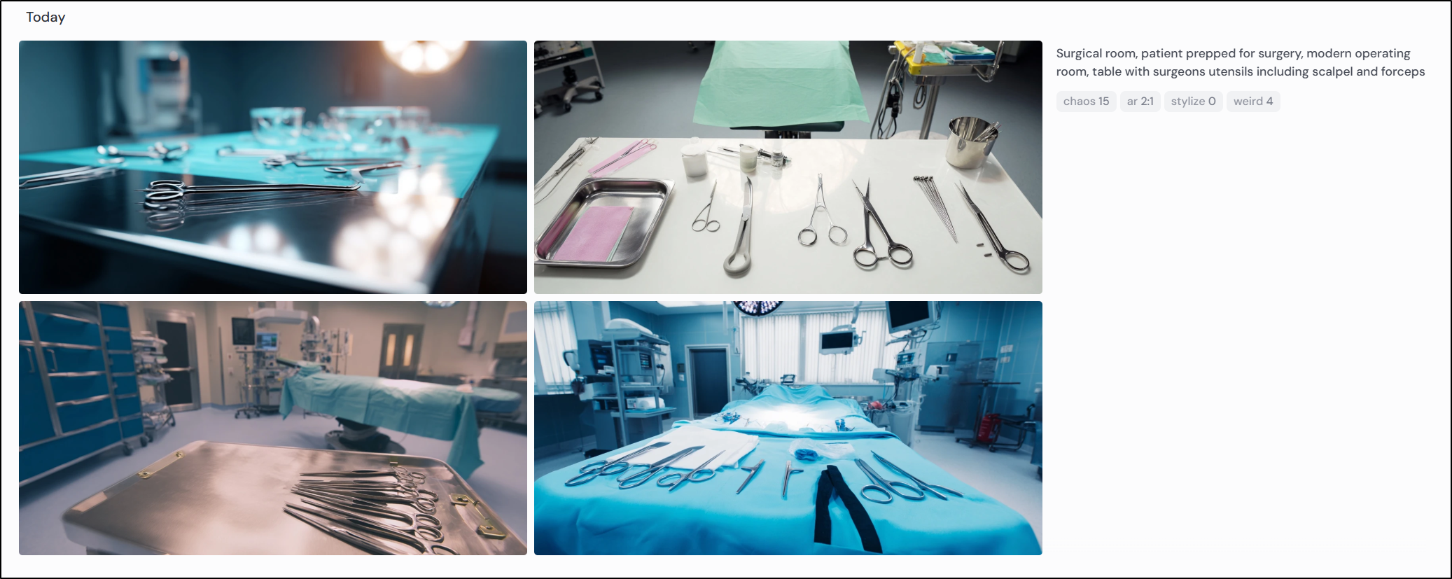 Here I asked for: “Surgical room, patient prepped for surgery, modern operating room, table with surgeons utensils including scalpel and forceps”