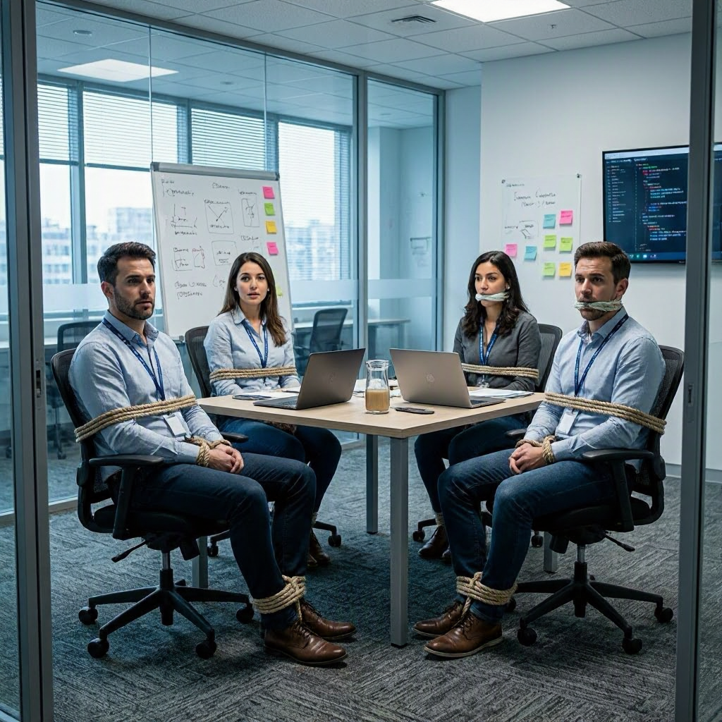 My last quick test of MAI is to do the one that is always flagged for violence/BDSM: “Software developers in a meeting room tied up in chairs with ropes”.